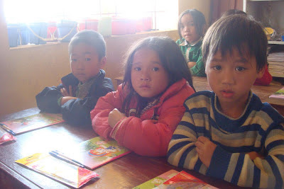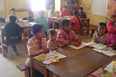 Ở trên này, hầu như đến lớp nào cũng thấy có những 'trứng vịt' (anh, chị) đi học ấp theo 'trứng gà' (em) để bố mẹ còn lên nương. Mình không còn vỡ cảm xúc như lần đầu gặp cô bé địu em đi học (cũng tại Hán Nắng này), ngược lại từ trước khi đi đoàn đã bảo nhau chuẩn bị dư dôi chút quần áo em bé, bánh, kẹo... để đỡ những nước mắt vì 'không còn gì trong tay' khi gặp những đứa trẻ 'ngoài danh sách dự kiến'.